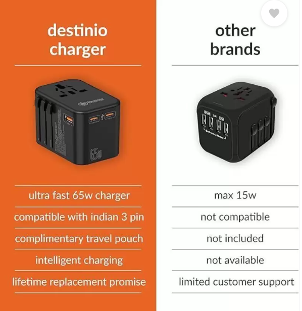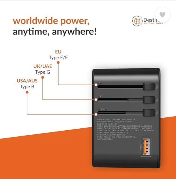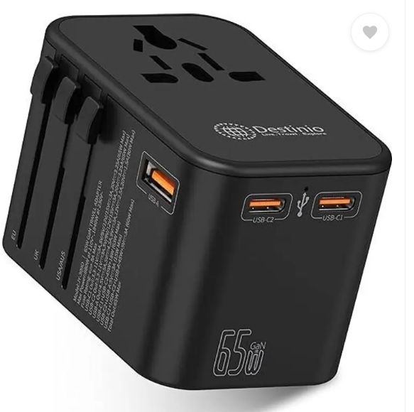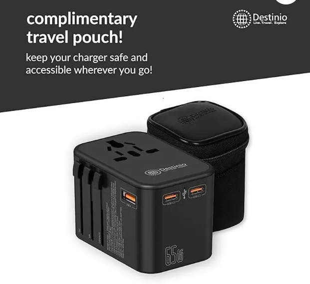 Destinio Universal Travel Adapter – Type C 65W GAN – Fast Charging 2 x Type C, 1 x USB Worldwide Adaptor (Black)