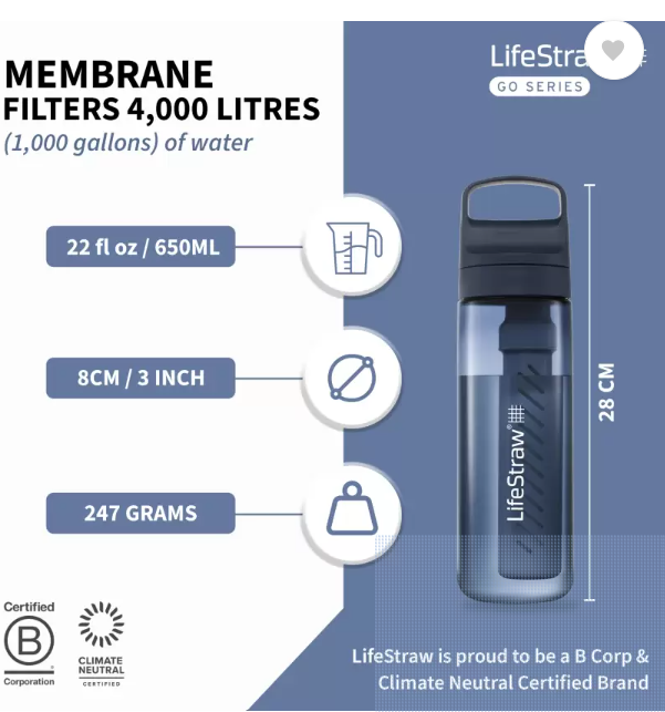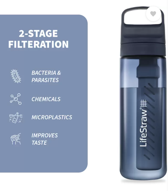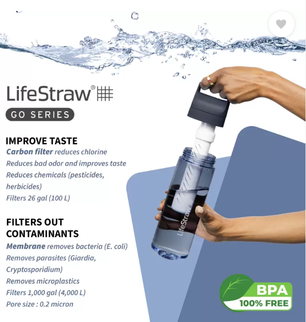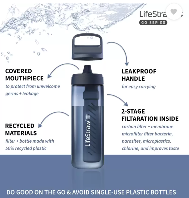 LifeStraw Go Series is the ultimate sidekick for safer, better-tasting water for travel and everyday use. The BPA-free bottle filters out nasties, so you can fill up from airport bathrooms, a tap in India, or a gas station while road-tripping. The advanced 2-stage filter improves taste and protects against bacteria, parasites, microplastics, chlorine, silt, sand, and cloudiness. The BPA-free bottle is made from 50% post -consumer recycled plastic. Do good on the go and avoid single-use plastic bottles. For every purchase, a child in need receives to safe drinking water for a year. The BPA-free bottle is made from 50% post -consumer recycled plastic. Do good on the go and avoid single-use plastic bottles. For every purchase, a child in need receives to safe drinking water for a year.